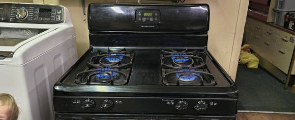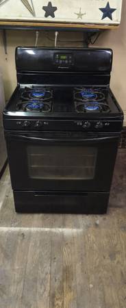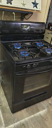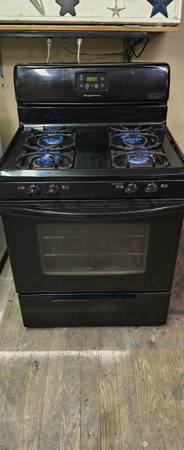 Frigidaire Black 4 Burner Gas Range. This Range is Only A Couple years old. You Might find On Sale for around 679.00. Save $300 + with us. This is a really Nice, Great Working, Well Maintained Unit. THIS IS A SELF CLEANING OVEN. This has 4 Top Burners with the Ovens & Broiler below on the Bottom of the Unit. This also does have a display Clock With Oven & Broiler Controls & Timers, etc. We have Completely Cleaned This unit Inside & Out. I have also Fully Tested All The Controls & Settings on this unit, Everything works Perfectly Fine. Should you have any questions please ask. Thanks.