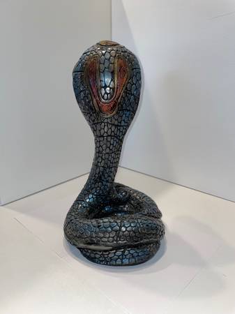 This vintage plaster cobra statue was manufactured in 1978 during the late 20th century. Standing at a height of 16 1/4 inches and 10 inches in diameter, this solid, hand-painted statue features intricate details weighing 10 pounds. This cobra statue would be a unique addition to any room as a decorative collectible.