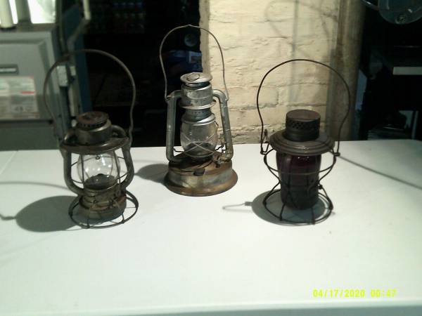 old oil lanterns two rail road markings LE&E R.R. red lantern penn. rr.$85. for all three.best to call or text leave mesage i'll get back thank you