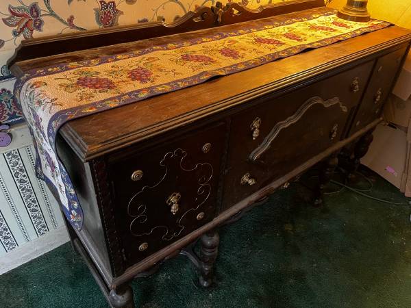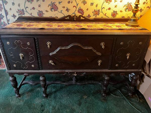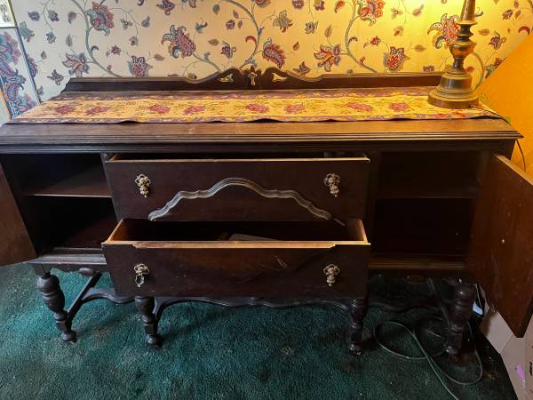 Greetings! I have a nice old buffet (aka sideboard) and hutch that just won't fit in my new (smaller) home. The buffet is 37"H (plus 4" for the back) x 67" W x 22.5" deep. The matching hutch is 55" H x 40" W x 15" D. Both have "patina" but clean up nicely and will look great in your vintage or modern home! Buffet - $125; hutch - $100; $200 cash for both. Prices are FIRM. I cannot deliver but I can help you load. Call or text 210, eight four two, 5055. It's a San Antonio number but I'm in Darlington. Cheers!