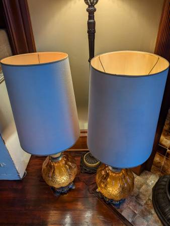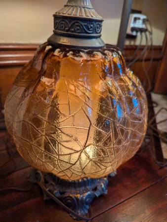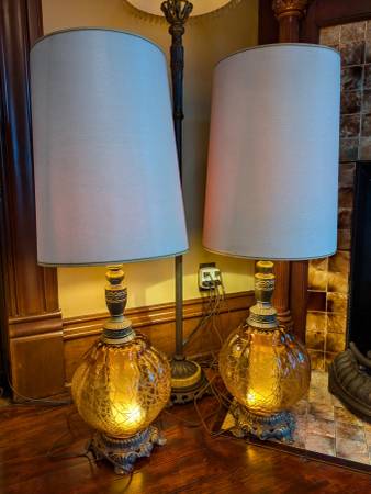 Beautiful pair of highly collectible mid-century, amber glass stately table lamps with original shades from our clean and smoke-free home. Absolutely stunning colors and the three-way switch works perfectly. You can light up just the globe or just the lamp or both for the right mood. Stands an impressive 40" tall to the top of the shade. Shade is 12" in diameter.