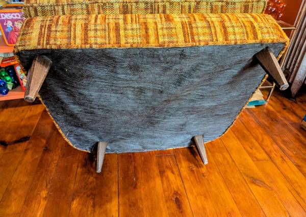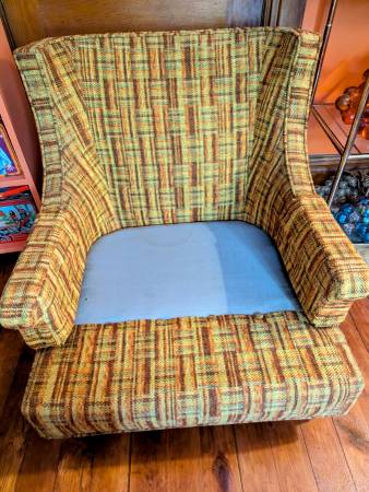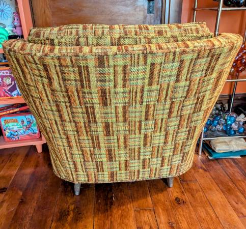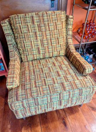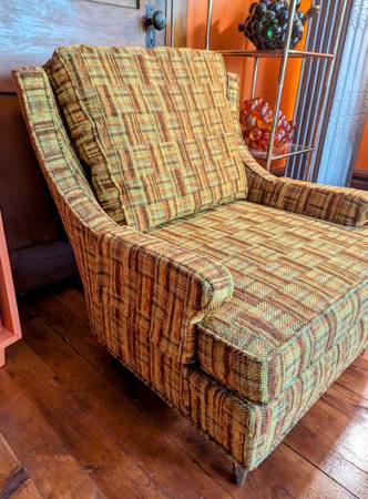 Retro vintage fabric upholstery plaid chair from our clean and smoke-free home. Chair is in overall excellent condition. Colors are primarily gold with rust, green and orange accents. Perfect for any decor, but especially nice in a funky, chic 60's, 70's vibe room. Check out the period legs and it even has the original arm covers. The cushions are removable for easy clean-up.