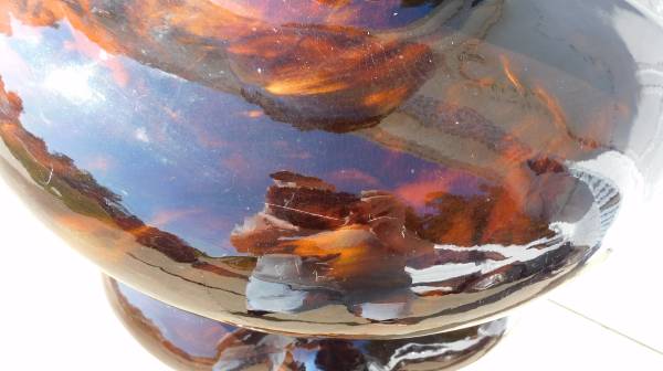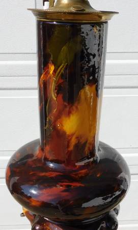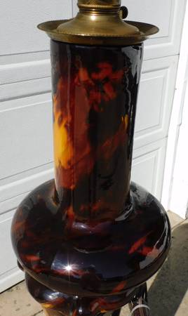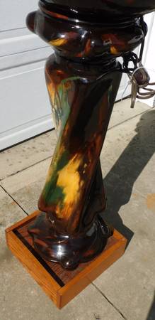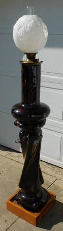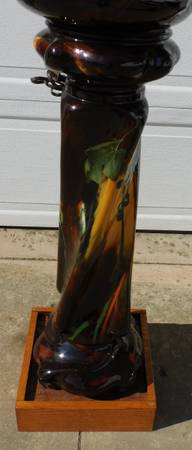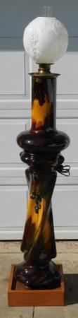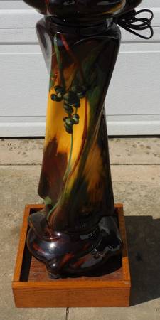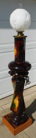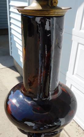 Up for sale is this Weller Pottery banquet or parlor oil lamp, that has been electrified. This rare piece is huge, standing a total of 66" tall. It consist of 4 pieces, the base, lamp, globe and chimney. It is signed Aurelian Weller on the bottom of both the base and the lamp. This is one of two Weller lamps that we are listing for sell, so please check out our other items. It is in good shape. Please note that there are a couple of small scratches on the lamp and both pieces have crazing (as to be expected. Please see the pictures and video and judge for yourself. It is approximately 66" tall (with out the wooden base) and 12" round. Cash payment can be made at the time of pick up. If interested, please call or text me at 330-five0six-3191. Thanks, Jerry.