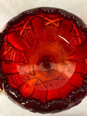 SELLING 2 BEAUTIFUL VINTAGE L.E. SMITH RED BOWLED COMPOTES WITH AMBER PEDESTAL BASES THEY ARE 6 1/2” HIGH X 4 3/4” WIDE MOON AND STAR PATTERN NO CHIPS OR CRACKS BEAUTIFUL