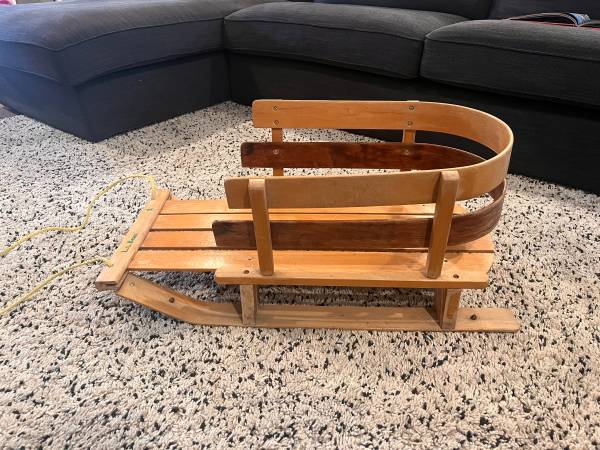 Up for sale: a timeless wooden pull sled from L.L.Bean — built to last. Features include a hardwood wood slat seat and back rails, wood runners, and front pull rope. Great for snowy backyard fun or as a vintage display piece.
