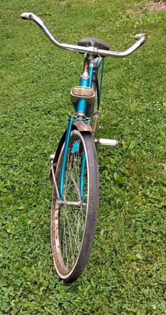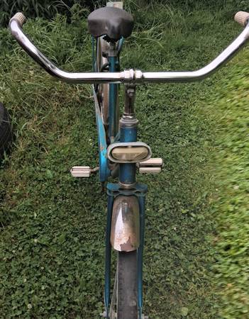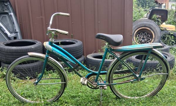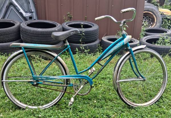 Up for grabs is a vintage Murray Jet Fire cruiser bike in original condition. This classic American-made step-through bike features its iconic teal blue finish, retro chain guard graphics, and fenders with patina that speaks to its history. Whether you’re into restoration projects, retro decor, or just love old-school rides, this is a solid piece of bicycle history.