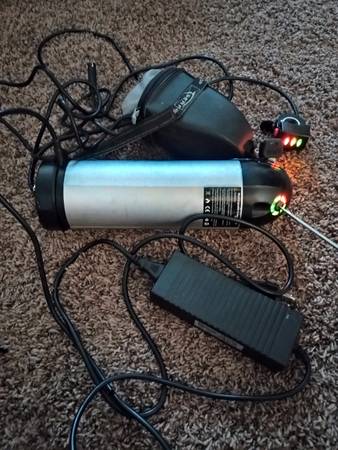 1- used ebike battery with mounting rack and electrical system. The battery was used for 14 miles roughly every other day for about a year, but still charges well. The wiring system has been patched after some internal damage. Originally valued at $250.