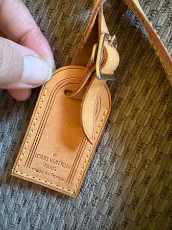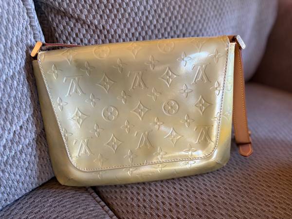 Authentic LV leather and patent bag, vintage from the early 2000s, you can look up the style & prices on EBay, leather tag was added. Plz look at pictures closely, overall good condition, tag does have small stain and wearing at buckle but tag is removable, would probably clean right up with leather oil, bag is in really nice shape; bought for myself but too small for my needs. Serial # is stamped near stitch line inside as well.