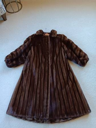 Women's female demi buff full length coat. Length 48". Sweep 85". Width at waist 50". Sleeve length 24" from shoulder, 30" from neck. Size 12 (approximately). Cash only.