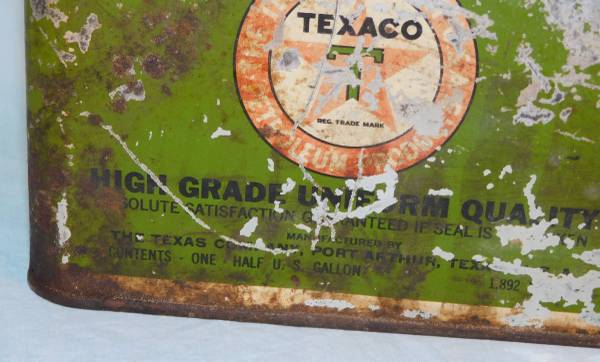 Up for sale is this vintage Texaco Motor Oil, medium can. It is a 1/2 gallon can, with a handy grip and a swing spout. It is in fair shape. It does have paint loss and rust on it, so please look at the pictures and judge for yourself. It is approximately 6 1/2" tall, 8 1/8" wide the 3" deep. If interested, please call or text me at 330-five0six-3191. Thanks, Jerry.