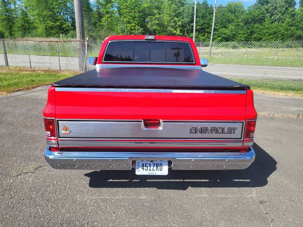 Regular cab, short bed, square body. 350 engine, 700R automatic transmission with overdrive. Red with black interior & tonneau cover. Working factory air. Power brakes, steering & windows. Rear slide window, Sony stereo, back up camera, new dual exhaust, projection headlights.