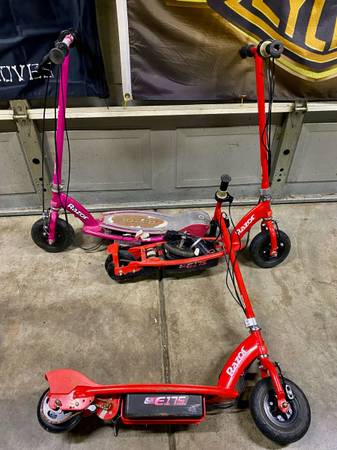 Razor Electric Scooters. Two for parts. One Razor electric scooter e175 that’s like new and runs off any dewalt 20 volt battery. Batteries not included.
