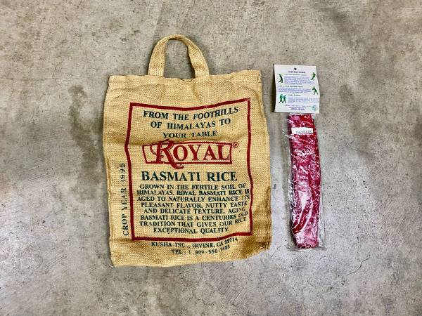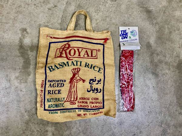 Royal Basmati Rice jute bag and Tie One On Bandana Coolers.