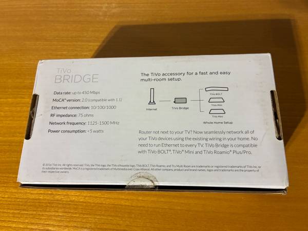 TiVo Bridge MoCA 2. 0 turns your home's coaxial wires into a high-performance Ethernet Network and allows cable broadband Subscribers to distribute multimedia content through their home while ensuring lightning-fast speed, High reliability and the performance of a wired connection With speeds up to 450 Mbps bi-directional combined.