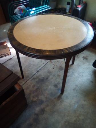 Reduced! Vintage Round Card Table, 35" across x 28.5 high, legs fold for storage, Very sturdy, asking $45 obo, must pick up in Boardman, call afternoons or evenings