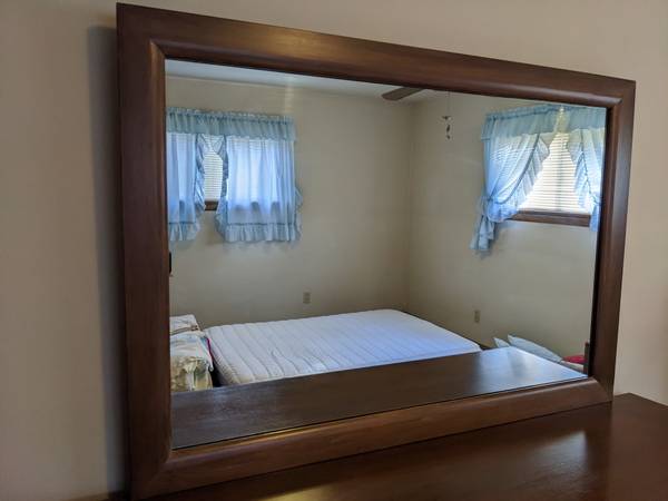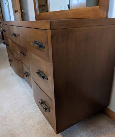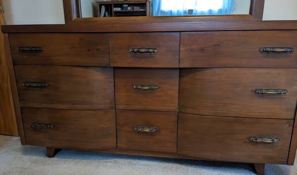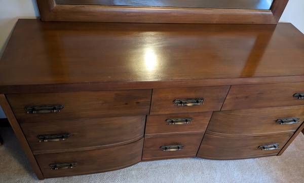 Vintage Drexel 9 drawer solid wood dresser with mirror in excellent condition!! Dresser is 5' long, 31 1/2 in high, 20 in deep Mirror is 35 1/2 in high, 51 1/2 in long Estate sale - Search number...