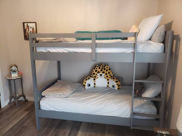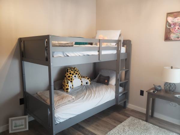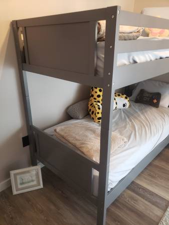 Solid wood bunk beds with mattresses. Rarely used for the grandchildren. Only a couple years old. Perfect condition! $250 for the beds, mattresses, sheets and pillow cases. A must see! Phone calls...