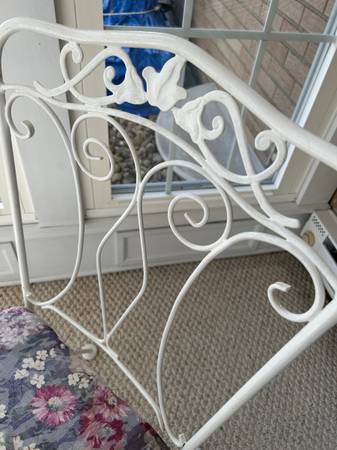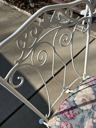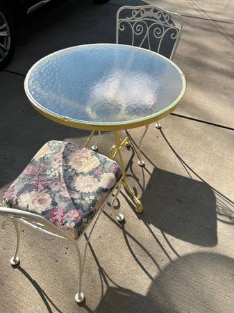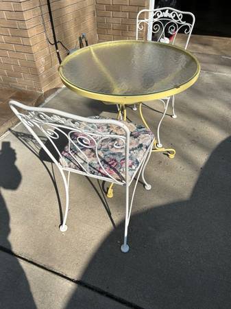 Vintage Lyon Shaw wrought iron table with two chairs. High quality vintage furniture features ivy / honeysuckle pattern. Seat cushions are covered with lavender floral print on white metal. Table features glass top and is in original yellow metal paint. Furniture has been stored indoors and is in excellent condition for its age. No rust and cushions are free of rips, tears, and stains. Furniture comes from a smoke free, pet free environment. Please call show contact info