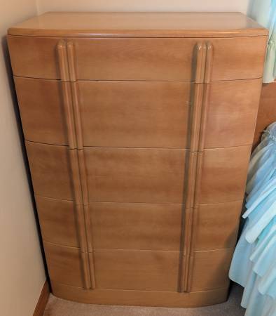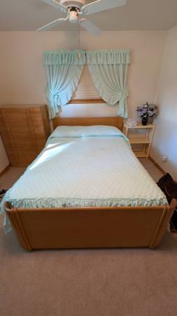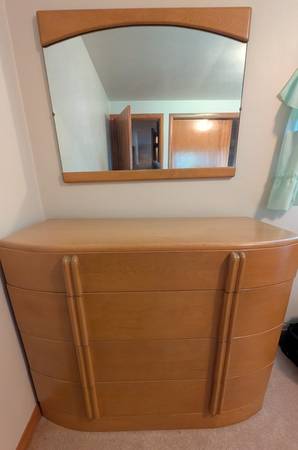Antique bedroom suite in near perfect condition. Solid wood. Includes five drawer Highboy dresser, four-door dresser with mirror, full-size bed frame and mattress. No lowball offers, the dresser is worth $1500 by itself.