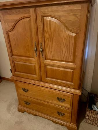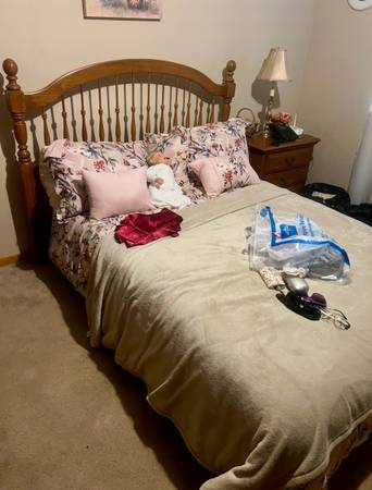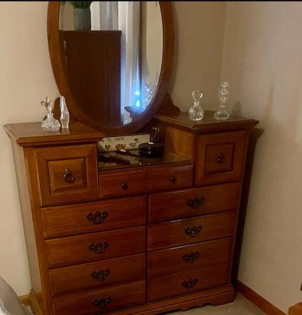 Oak bed, tall dresser, dressing, table, dresser with mirror TV cabinet with drawers and nightstand like new
