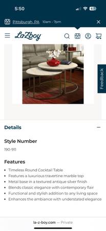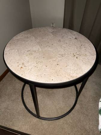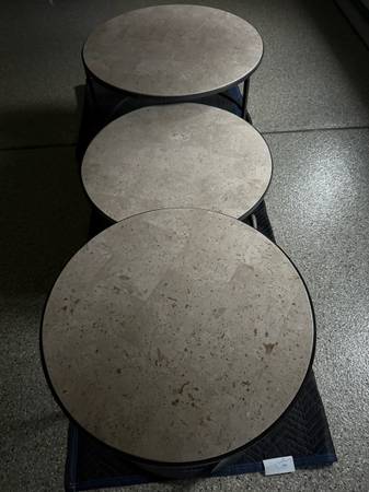 Nesting/ tables in like new condition the two table set by itself is selling for $1,049 new right now and the extra side table that matches is selling for$559 new. These are marble top with a textured metal base in an antique silver finish these are good quality sturdy tables could deliver locally. Asking $300 for the whole set .