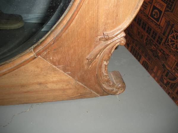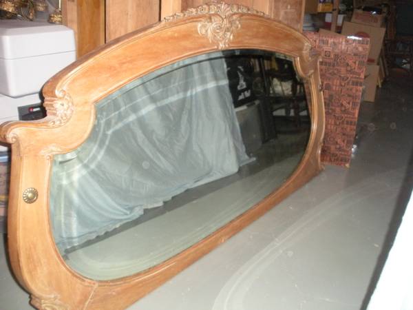 Very nice beveled edge mirror with hand carved flowers on the top and sides. It is 33” high from the bottom to the top of the carving, 60” wide by 5” wide. It has a chain attached to the back for...