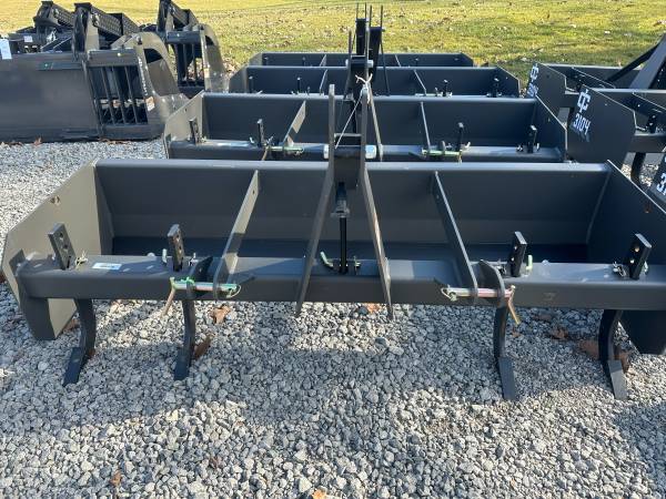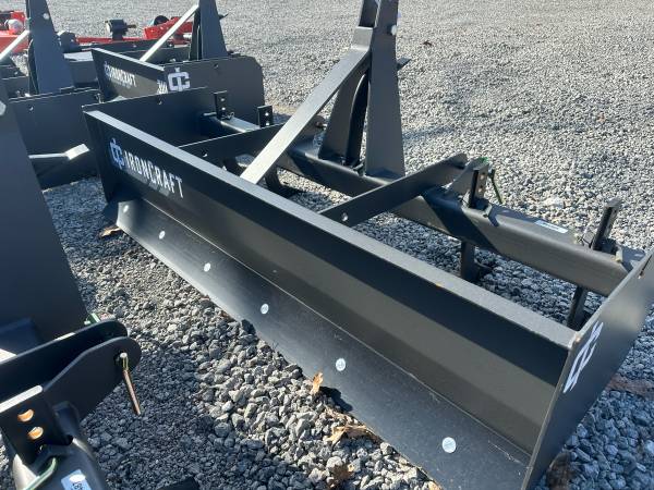 IronCraft 6’ 72” box blade. 3106. Standard duty. Working topsail, gravel, mulch, or manure. HP required 15-45. 5 shanks. 6” cutting edge. 367lbs. Cat 1. New with one year manufacture warranty. Made in the USA. $1100. Call show contact info