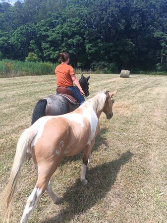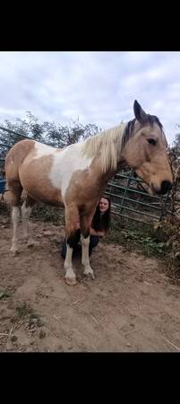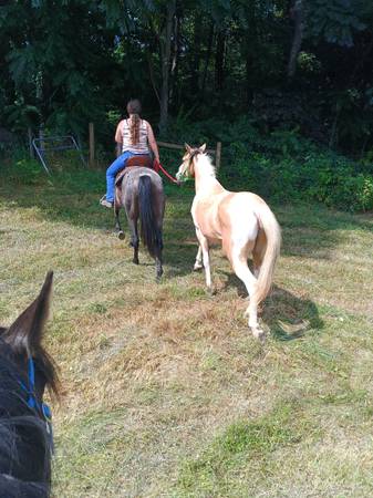 2 1/2yr old buckskin paint gelding very well started NOT BROKE. easy to do his feet. sound. about 142.-14.3hds loves ppl. comes right to you in the field. has been saddled and ponied all thru summer on the trails. knows how to lunge and stands to be saddled he has had someone sit on his back once and he was good and didnt mind at all. hes a very sweet horse. My daughter messes with him all the time and she also ponies him on trails... And he walks right onto a trailer.. He's current on shots just not a coggins...and I'm UNABLE to get one due to working the same hrs my vet office is open...and I DONT skip work....located in hammondsville ohio CASH ONLY he has been on our farm since the beginningof last yr and hasnt travelling off our property.
