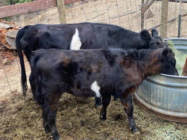 2 year old cow 1/2 dexter 1/2 belted Galloway pulled. She has a dexter Galloway cross heifer calf 5 months old. Hasn't been milked yet but that was the plan. She has been exposed to a galloway bull.