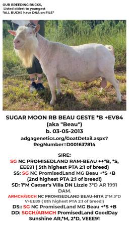 Nigerian dwarf buck. Son of Sugar Moon RB Beau Geste. Clean tested.
