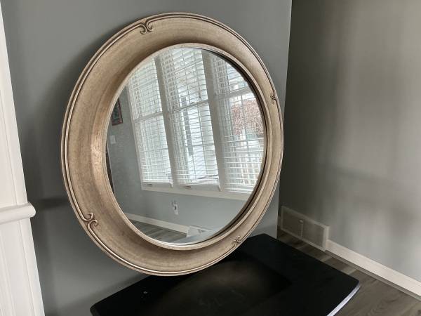 Embellished with carved beading, this accent mirror features a natural looking light weight material in an aged finish. With notes of driftwood & sun bleached timber, this mirror is perfect for dressing a traditional or coastal style interior. Excellent condition.