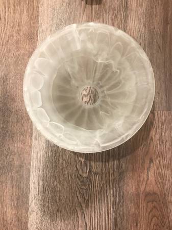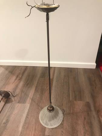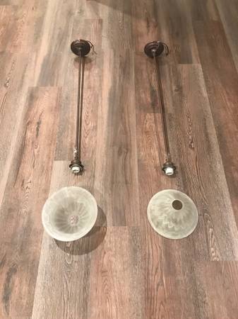 One pair Murray Feiss pendant lightdswith shade and ceiling canopy. Each light has a tea-shade colored glass shade measuring 9.5 inch diameter x 5 inches high. Can be put on dimmer. Currently hangs 38 inches from ceiling to bottom of shade. Pendant rod made of three sections 9.5 inches long and can be unscrewed and shortened to desired height. Finish is a weathered patina, similar to oil-rubbed bronze. These pendants match the 9 light chandelier posted separately. Please call show contact info