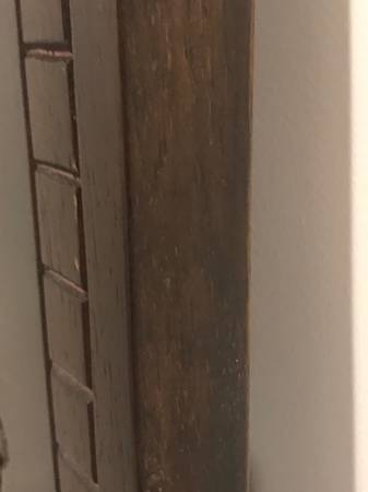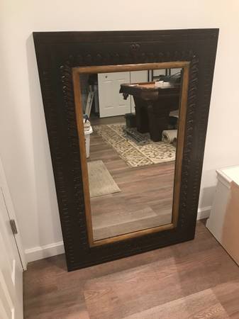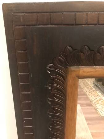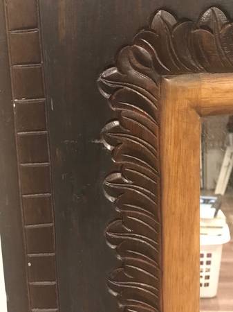 Pier One Balinese Accent Mirror will provide an added touch to any wall. Its frame is crafted from wood with carved detailing in a rich dark brown finish with a dark gold inner frame around the mirror. The overall mirror measures 32" x 48" with the frame. The mirror measures 19" x 35 1/2". The mirror can be hung either Horizontally or Vertically. Please call show contact info