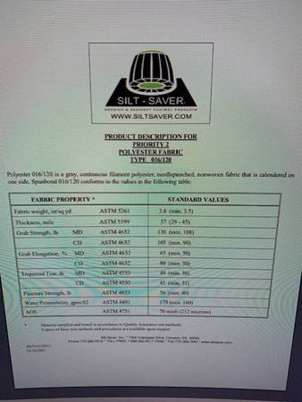 New Silt Saver Silt Fence by the pallet Priority 2. It comes 20 rolls per pallet 100' per roll, 2000 ' LF per pallet for just $240 pallet. The rolls are 3'x100' with 4' stakes every 6' on center with lathe holding stake to fabric. This is left over from government job and while it lasts. We have about 5 semi loads left and can load your truck or can get a quote from our neighbor trucking Co. for delivered price.