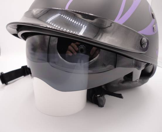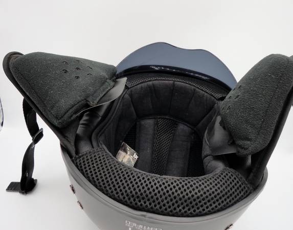 Motorcycle helmets with pull down visor, ear pads, quick detach strap. $45 each/both $80