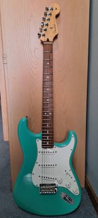 Selling my Fender Seafoam Green Stratocaster. It has only been used a few times in my house, never played out. It's in great condition, plays well and sounds great !! Comes with new strings, whammy bar and Fender padded gig bag in perfect condition. Will trade for equal value Fender Jazzmaster.