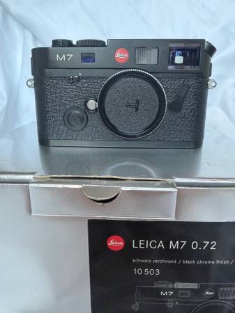 Selling all of my film bodies due to bad eye sight, regrettably I cannot use them any more. Near mint condition M7 in black chrome. One of the very latest production units with 35xxx serial number, from circa 2008. It has both the updated MP style finder and optical DX code reader.. Barely touched, very fresh, tested with film, works perfectly. Cosmetically very close to brand new. Still has protective clear sticker on the back plate. Everything looks and works as it should. Quite possibly the "newest" M7 you can purchase today.