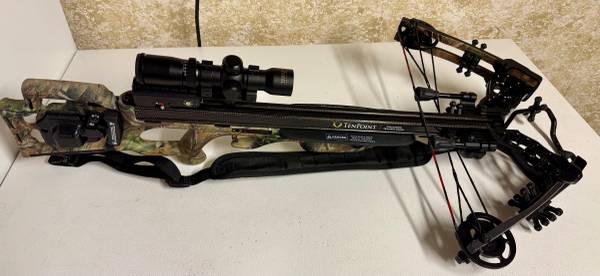 Has a TenPoint Rangemaster Pro scope mounted, aluminum 7/8” fixed dovetail mount, instant detach 3-arrow quiver, Brand new 3 pack of Pro V22 carbon arrows plus 5 more Pro V22 with lighted nocks. Plano Spire hard shell case. Bowjax crossbow noise dampening kit and SDS (string dampening system).