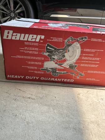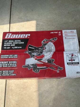 Bauer 12" Dual-Bevel Sliding Compound Miter Saw with Bauer 12" 32 tooth carbide blade. Saw is like new, used for one crown molding project and no longer needed. Horizontal cut line capacity: 3 7/8" x 14 1/2", 7 1/2" nested crown molding capacity, and 5" Vertical Baseboard capacity. Dual Bevel: 48 Degrees left and right. 60 Degree Miter Right, 52 Degrees Miter Left with 10 positive stops. Please call show contact info