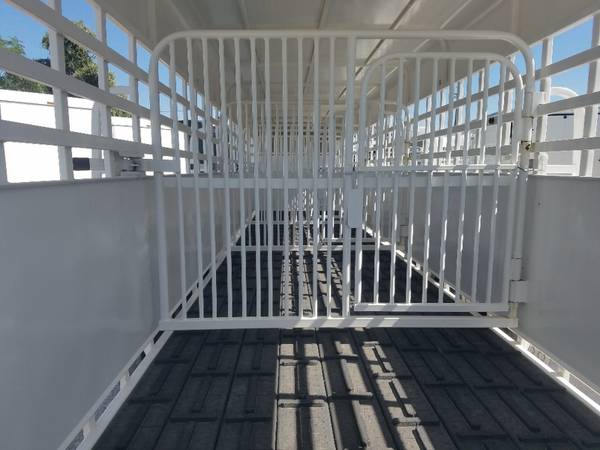 Rear gate is the butterfly style with a roller pin. Inside are three center gates with a sort gate. There is also an escape gate on the side. Floor is the cleated rubber type. Tires are 14-ply and in good shape. Color is white.