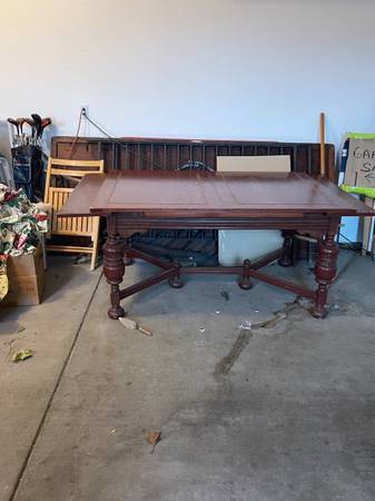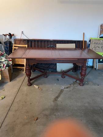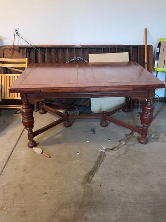 We are giving away our antique dining room table. It has 2 built in extension leaves to make the table up to 7 feet with both open. The table is 5 foot long with no leaves open or you can just open one leaf and make the table 6 foot long. It measures 3‘4“ wide. and 2‘,6“ high.